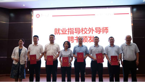 仪式上,支启军、余颖为我校就业指导校外导师石云爱、陈玉珊、黄小宇、沈岳军、朱义杰、刘明卡颁发聘书。